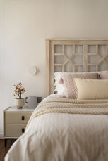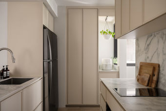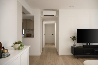 Crafted as a tranquil haven for young couples, this interior exudes serenity with its dominant cream palette. Plush furnishings envelop the space, creating an inviting atmosphere for relaxation. Delicate light wood accents have been thoughtfully incorporated, adding a natural touch that enhances the balance of modern aesthetics and romantic charm. The result is an intimate sanctuary seamlessly blending contemporary elements with soothing tones, providing a comforting escape for the couple to unwind and connect, accompanied by their furry companion, within the calming embrace of wood-infused warmth.